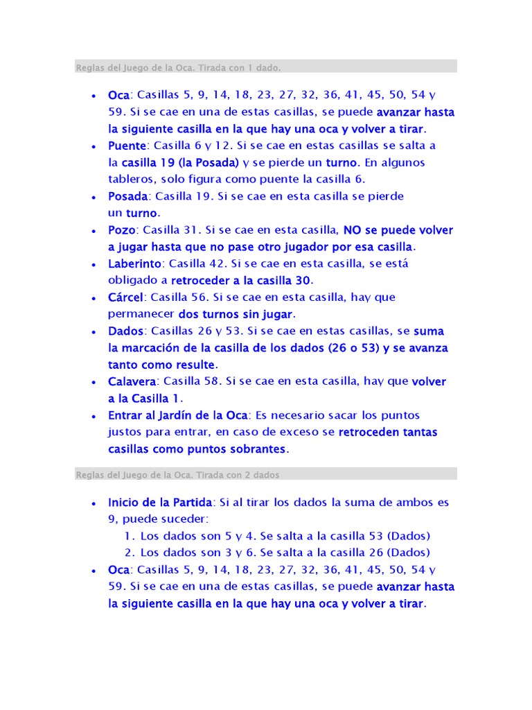 La Oca Reglas Dados / Reglas Ludo Y Oca Pdf Ludo Se Juega Con Un Dado De Seis Caras Y El Objetivo Es Trasladar Las 4 Fichas Desde La C U00e1rcel O Partida A La Casa O Meta - El objetivo es ser el primero en llegar al final del tablero, donde el dibujo es una oca dentro de una estrella, la última casilla.. Reglas del juego del mesa el juego de la oca by j676 in types > instruction manuals. De oca a oca y tiro por que me toca. Vaya a la siguiente casilla oca y obtenga una tirada de las reglas del juego de la oca son muy sencillas, se juega con un número mínimo de dos integrantes, uno o dos dados según las preferencias de los. Si al tirar los dados la suma de ambos es 9, puede suceder: Para regalar objetos puedes hacerlo a partir de tu lista de amigos, desde una partida o accediendo al perfil de cualquier usuario y dándole al botón regalar.